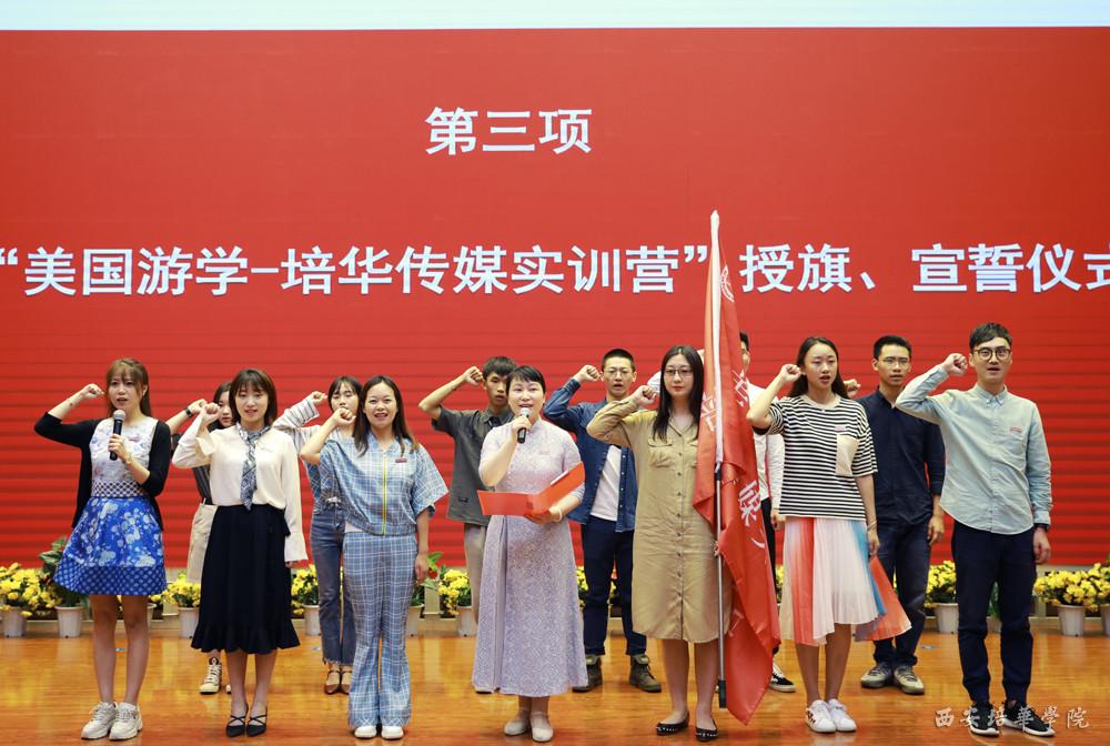 接下来传媒学院杜耀峰院长为赴美师生授“美国游学-培华传媒实训营”的团旗,“美国游学—培华传媒实训营”全体成员上台,团长买丽颖老师接旗。接过团旗,实训营全体团员进行了集体宣誓,承诺遵守法律法规,遵守校纪校规,维护良好形象,学有所成。