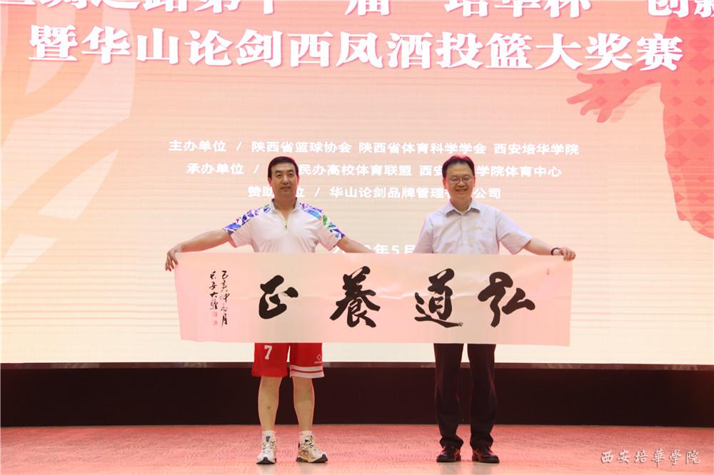 闭幕式最后,特聘请陕西省篮球协会副主席魏安、赵西斌;陕西省篮球协会艺术总监刘继红为西安培华学院客座教授。西安培华学院理事长姜波博士亲自为三位客座教授颁发聘书,同时,三位客座教授也为姜波理事长馈赠墨宝。