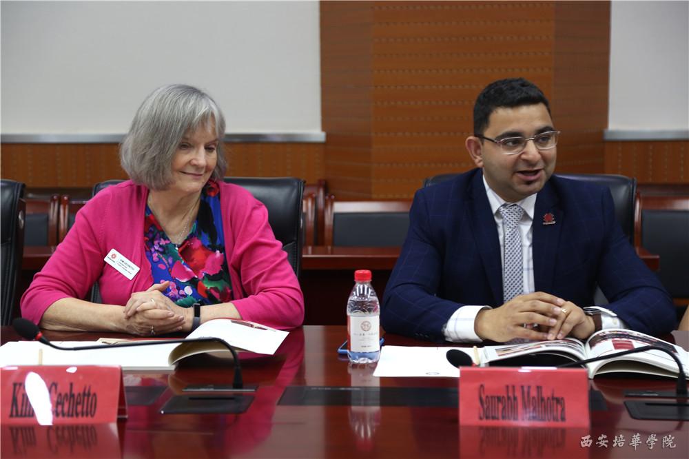 加拿大范莎学院国际部主管Saurabh Malhotra、加拿大范莎学院语言中心副院长Kim Cechetto、加拿大范莎学院国际教育顾问Leila Yang 简要介绍了范莎学院的办学特色、专业优势、国际化教育成果,对我校的热情接待表示衷心感谢。