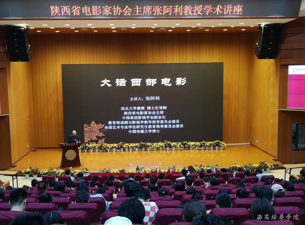 5月21日下午,陕西省电影家协会主席、西北大学博士生导师——张阿利教授,应邀做客我校“名家艺术讲坛”在维之图书馆报告厅作了题为“大话西部电影”的学术讲座。本次讲座由我校艺术教育中心和传媒学院联合主办,艺术教育中心主任刘荣弟教授担任主持,我校相关专业师生近400余人参加学习了此次讲座。