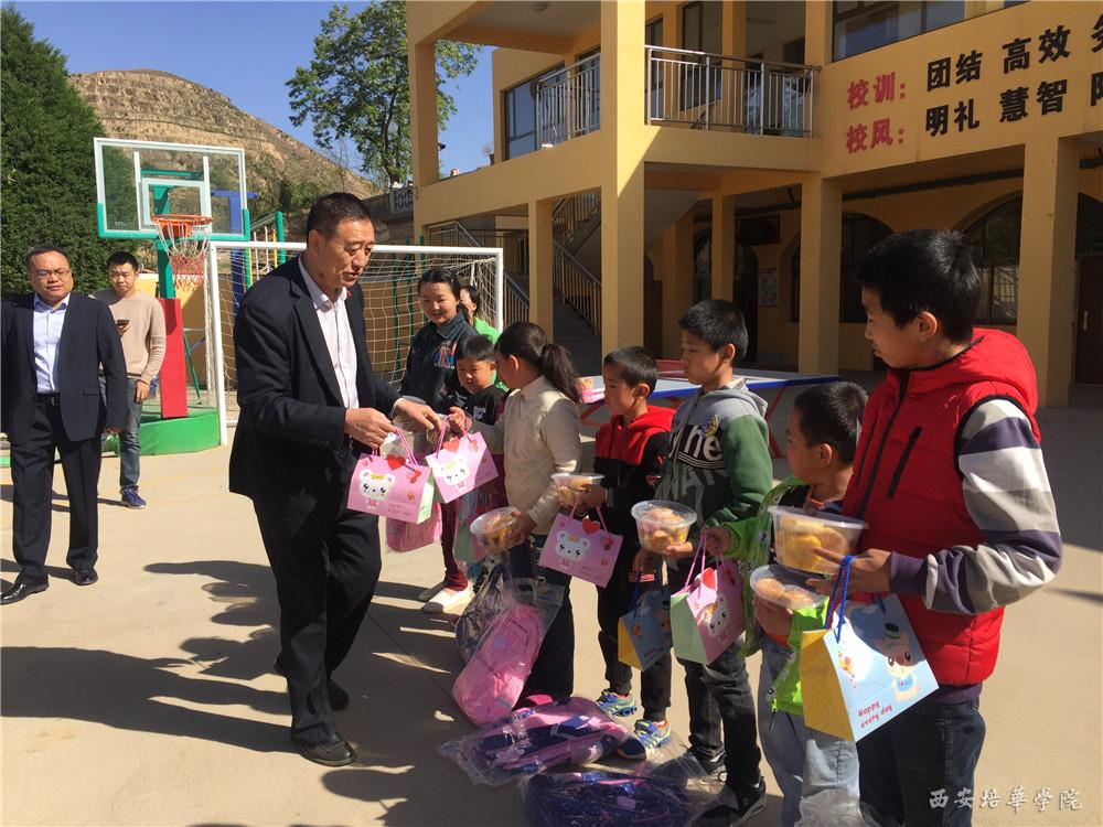 5月13日,扶贫团一行走进子洲县瓜园则湾乡中心小学,为该校留守儿童带去了书包文具等学习用品,学校姜波理事长的母亲郝玲玲女士(70岁高龄)心系公益,亲自参加慰问,为孩子们购买了零食和生活用品。慰问结束后,还举行了驻村干部轮换交接仪式,路水亮同志接替辛晓盈同志任西安培华学院驻瓜园则湾乡艾家畔村工作队队长。子洲县副县长曹晨、瓜园则湾乡党委书记张杰等参加了活动。