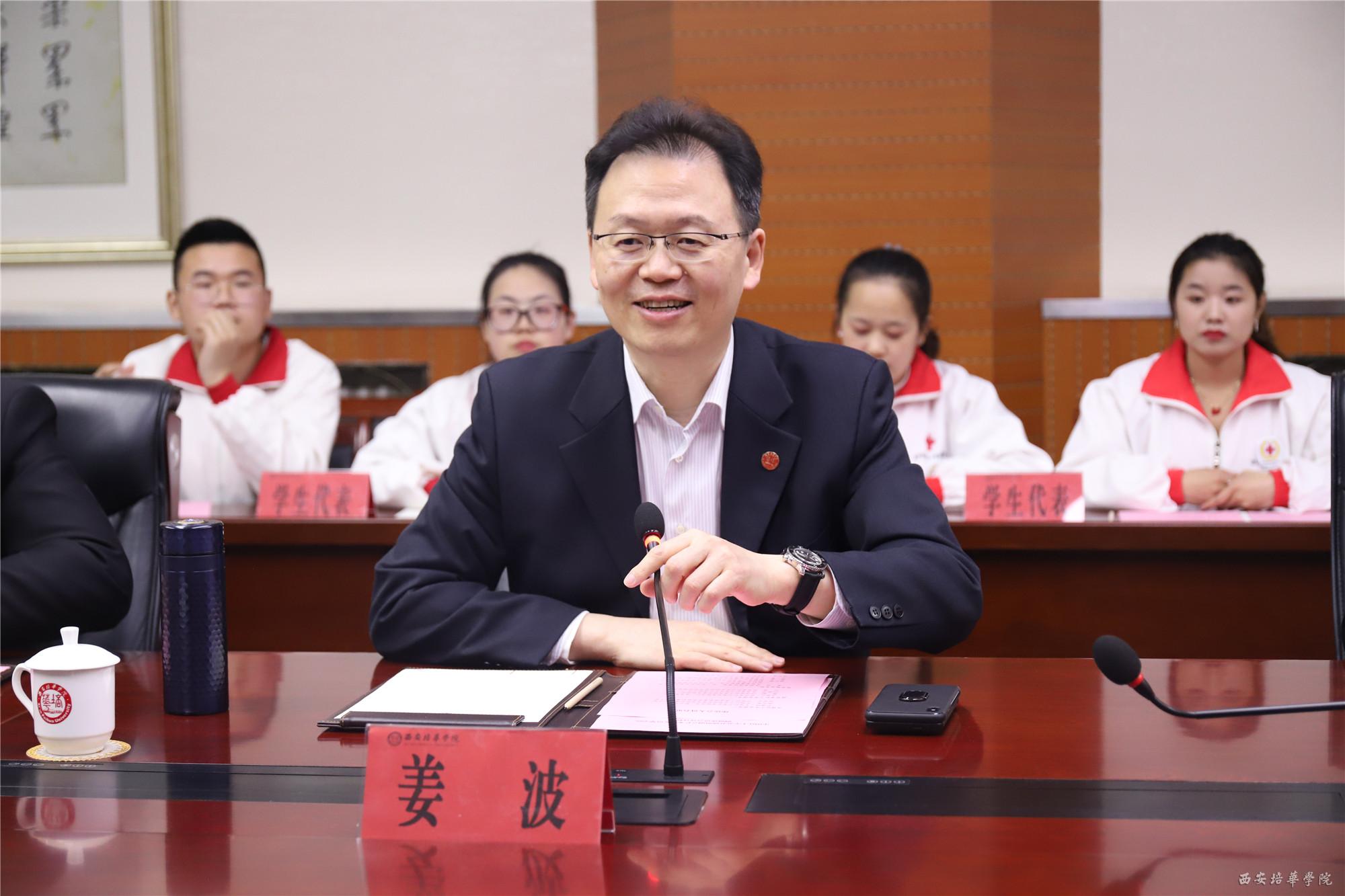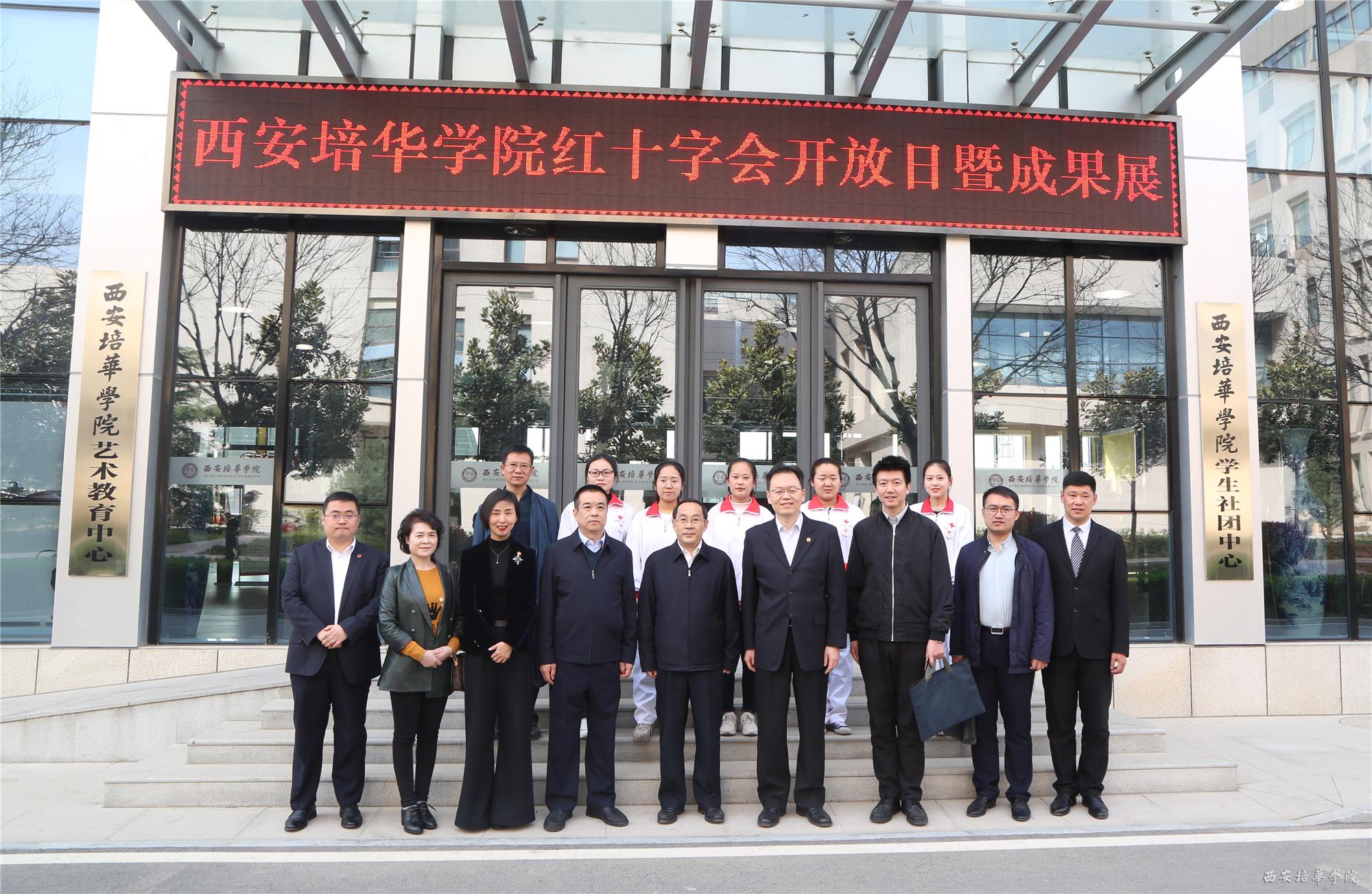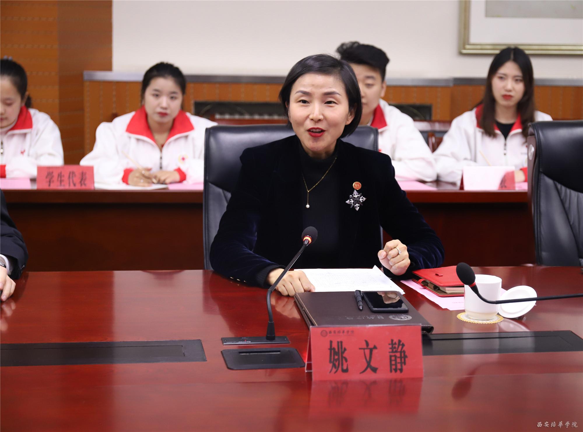 西安培华学院理事长、西安培华学院红十字会会长姜波博士出席座谈会并致辞,副校长、党委副书记、校红十字会常务副会长姚文静,团委书记蔡亮,校红十字会发起人田菁,团委副书记、校红十字会秘书长屈先锋和我校红十字会学生代表等十余人陪同调研。
