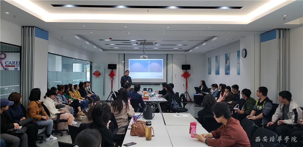 科锐国际西安公司经理阮鹏飞带领师生们参观了公司,简单介绍了公司的办公环境。科锐国际总经理何洪锴介绍了科锐集团的发展历程。陕西科锐集团经理阮鹏飞致辞,他感谢西安培华学院对他们企业的信任与期望,并提出科锐集团响应国家“一带一路”的战略目标,希望能帮助我国民营企业、国企走向国际化。最后希望通过订单班项目能够把企业知识技能更好的传输给学生,实现校、企、生多赢的目标。
