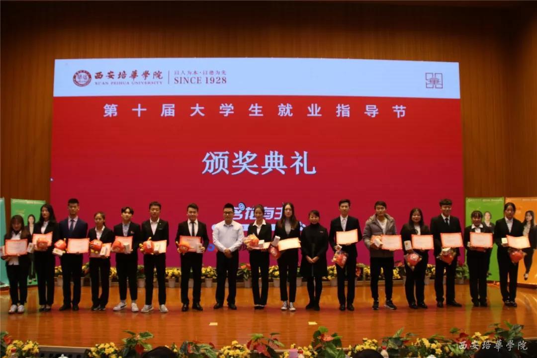 58同城西安站市场部经理刘腾飞,招生与就业指导中心副主任王琳为获得“最佳网络人气奖”的选手颁奖