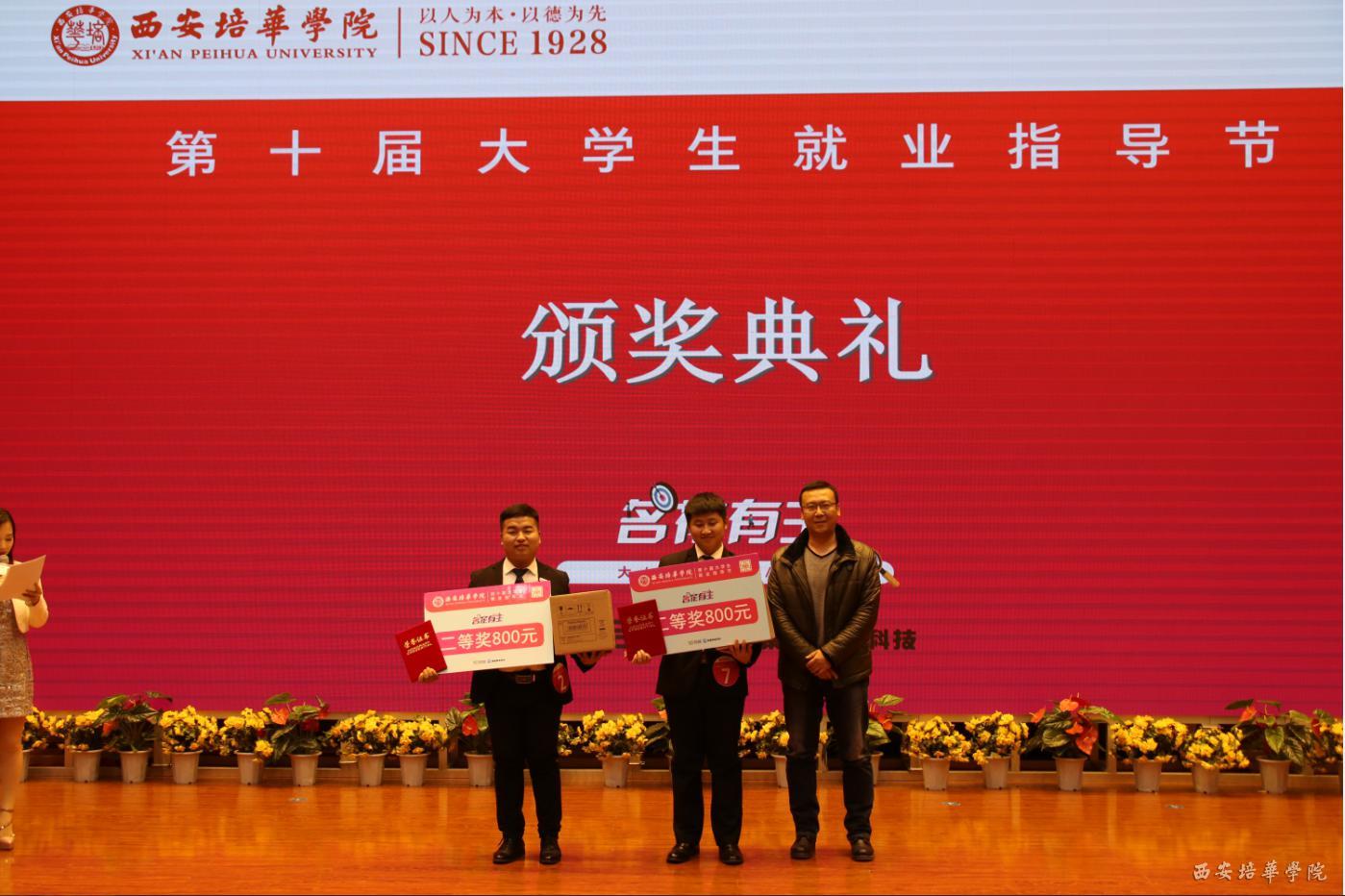 医学院孙天文、智能科学与信息工程学院刘鑫亮获得二等奖,西安市人才服务中心毕业生就业指导部就业指导科科长张志诚为他们颁奖