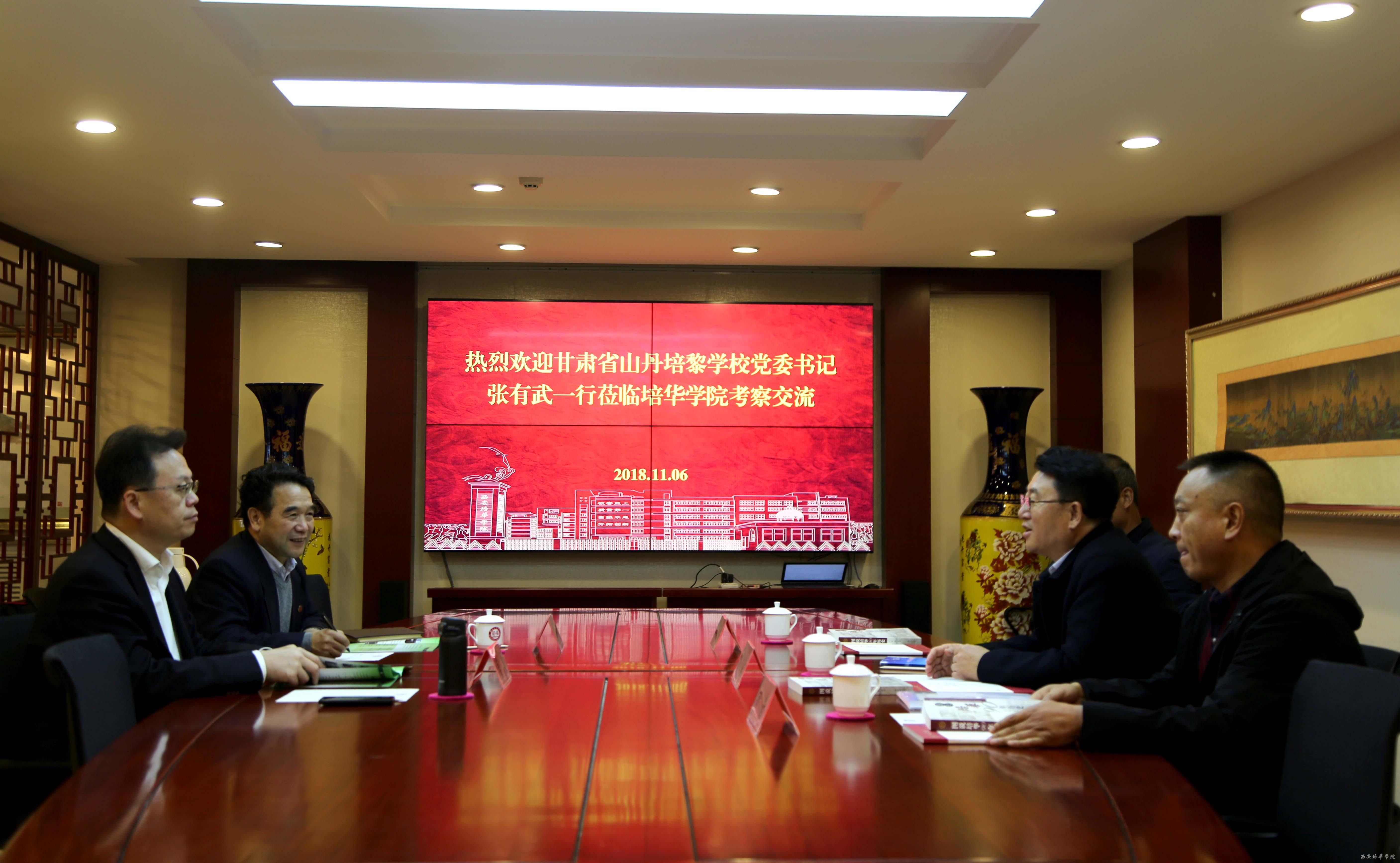 姜波理事长热情欢迎张书记一行专程来访和交流,并向客人介绍了培华学院发展、历史和在建设省级应用型示范高校过程中的经验,并为山丹培黎国际职业技术学院的建设、设计等提出真挚的建议。张有武书记代表山丹培黎学校首先祝贺我校成功举办九十周年校庆,详细介绍了中国工合山丹培黎学校的历史、建设和发展,学校的现状,特别是甘肃省政府和教育主管部门以山丹培黎学校为基础建设山丹培黎国际职业技术学院的计划和建设进展,希望以此为契机希望寻求合作的设想和计划。