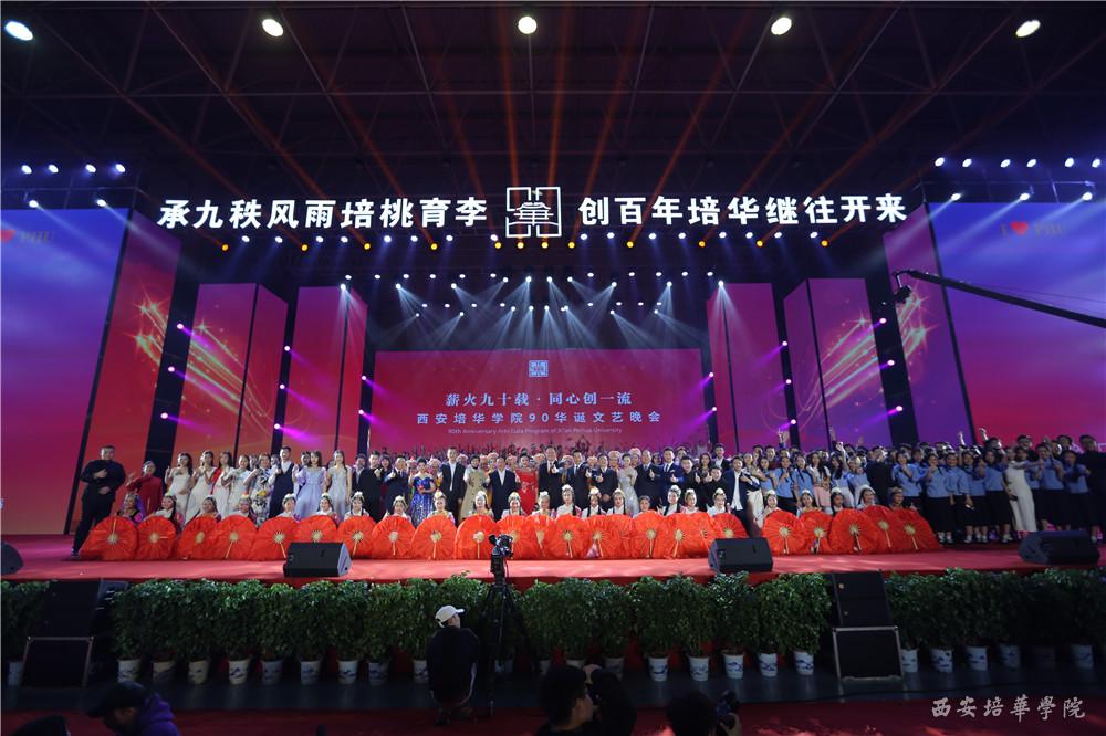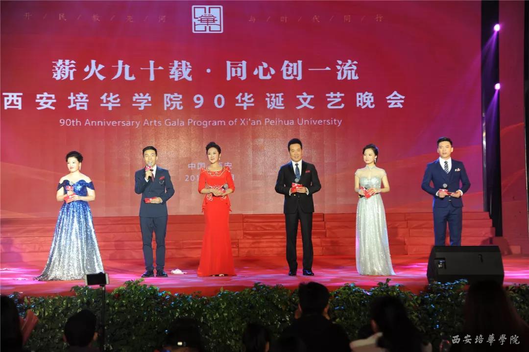 10月21日晚,“薪火90载 同心创一流”西安培华学院90华诞文艺晚会盛大开幕,全国人大代表、西安广播台主任播音员孙维,陕西广播电视台主持人徐杰、我校2012届校友,陕西人民广播电台节目主持人高素,我校2013届校友、山西广播电视台节目主持人晨亮,我校播音主持艺术专业教师屈阳、学生胡永泰组成超强阵容主持团。我校全体校领导与来自祖国各地的各届校友,在校师生共三千余人欢聚一堂共庆培华90华诞。晚会还进行了现场直播,约12万人次通过网络观看晚会,为培华送上生日祝福。