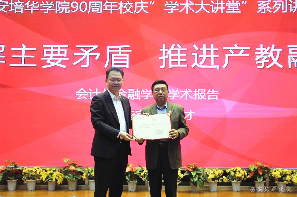 10月15日上午,我校会计与金融学院邀请中国高等学会高等财经教育分会副理事长兼秘书长张国才教授于维之图书馆报告厅举行了以“破解主要矛盾,推进产教融合”为主题的迎校庆学术大讲堂。学校理事长姜波博士出席活动并为张国才教授颁发客座教授聘书。此次讲座由会计与金融学院院长赵选民主持。