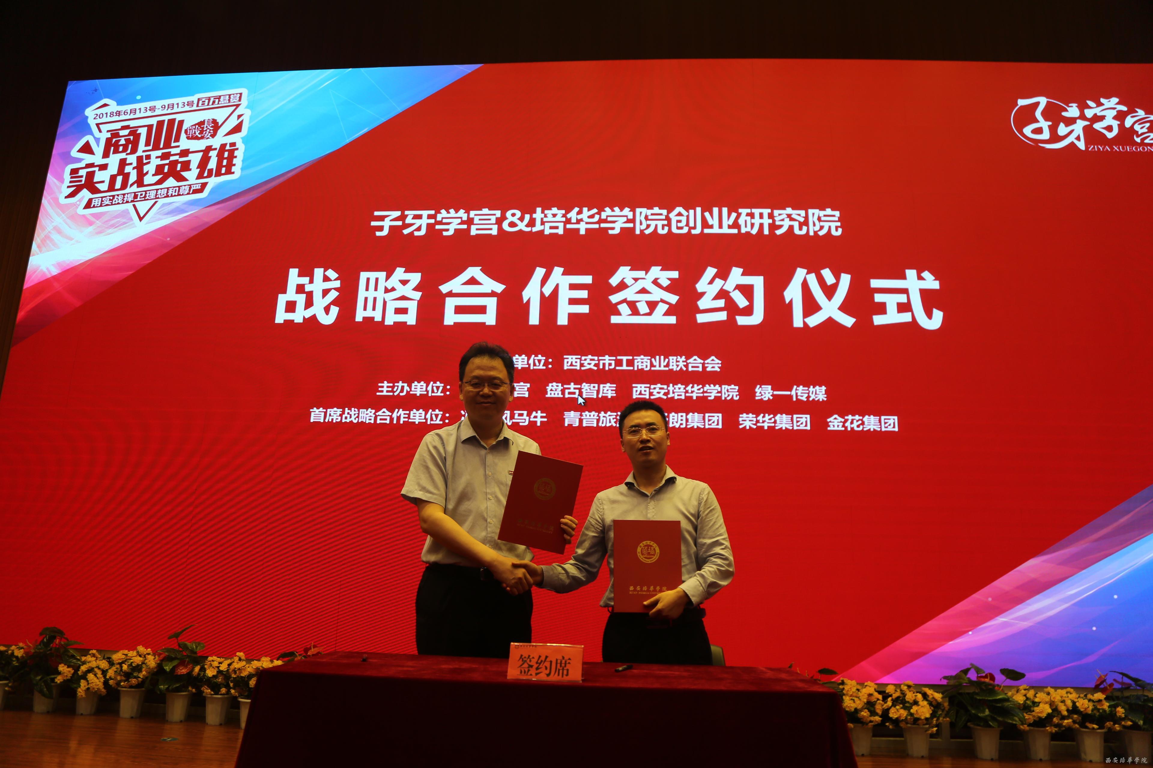 仪式现场,我校与子牙学宫签订了战略合作协议,今后双方将合作共建创业研究院,并在创新创业教育研究,产学研合作等方面展开深度的合作,共同致力于培养和提升培华学生的创新创业能力。