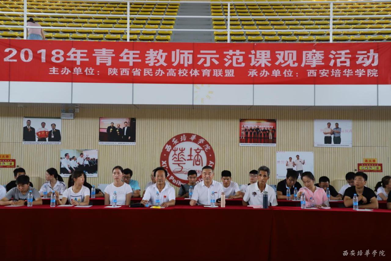 6月15日,2018年陕西省民办高校体育联盟公开示范课观摩活动在西安培华学院体育馆举行。全国民办高校体育联盟常务理事长兼秘书长、陕西省民办高校体育联盟顾问、西安培华学院副校长、党委副书记、校体委主任、工会主席、体育中心主任徐国富教授;陕西省民办高校体育联盟常务理事长兼秘书长、陕西商贸学院体育部部长刘万斌教授;全国民办高校体育联盟学术委员会主任黄生勇教授;全国民办高校体育联盟学术委员会主任苟定邦教授等出席了活动。