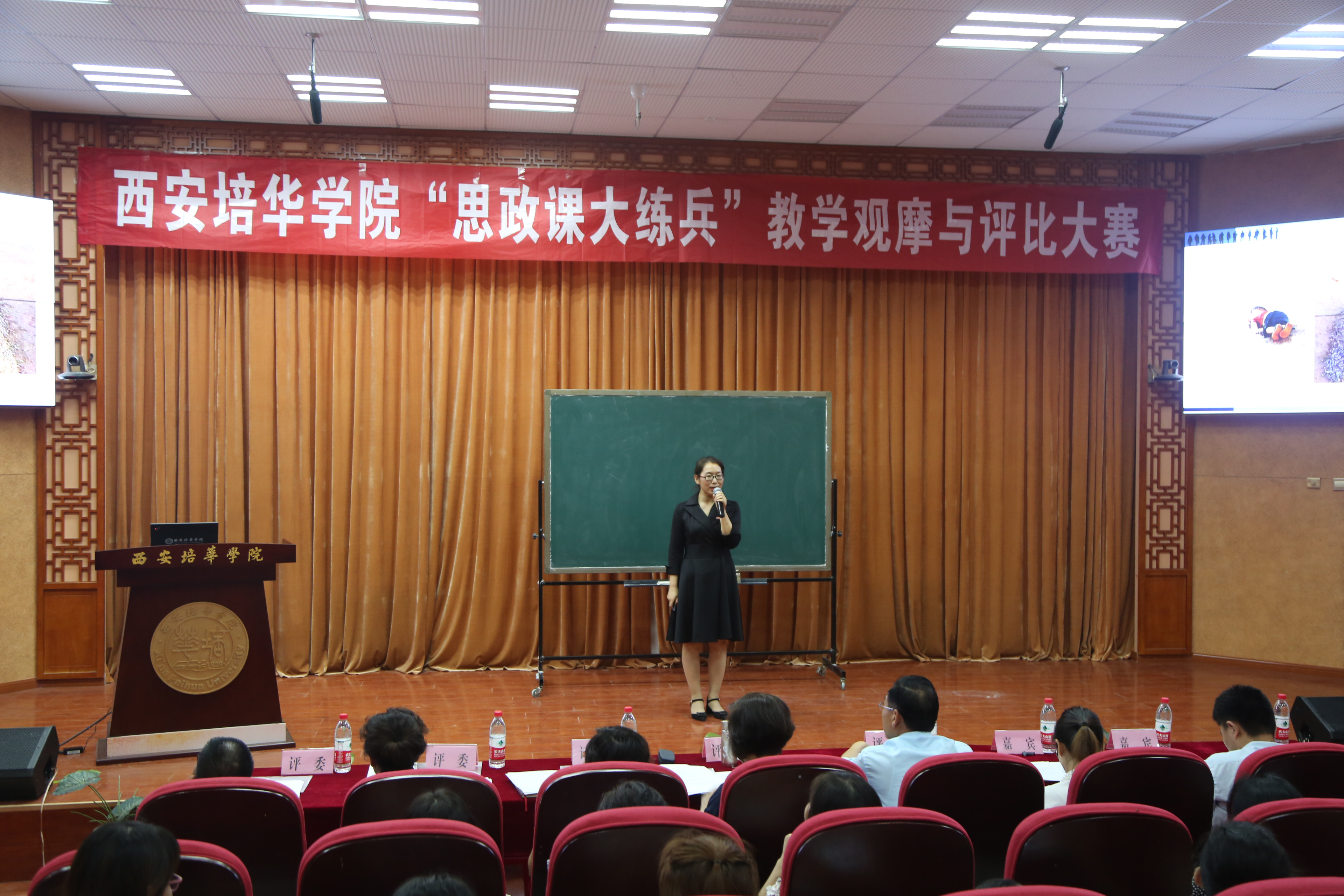 担任比赛的评委有西安培华学院副校长、学术委员会主席刘越莲教授、西安培华学院教务管理中心主任唐学学副教授、西安培华学院转型发展与迎评办公室主任陈来应副教授、西安培华学院思政部主任史晓眉教授、冯小卫教授。校党委工作部陈玲部长和党委宣传部柳雨部长到现场指导,思政部全体教师和部分学生一起观摩了大赛。8位教师进行了现场展示,她们是经过教研室初赛、思政部复赛才进入了校级比赛。比赛由思政部陈欢讲师主持。