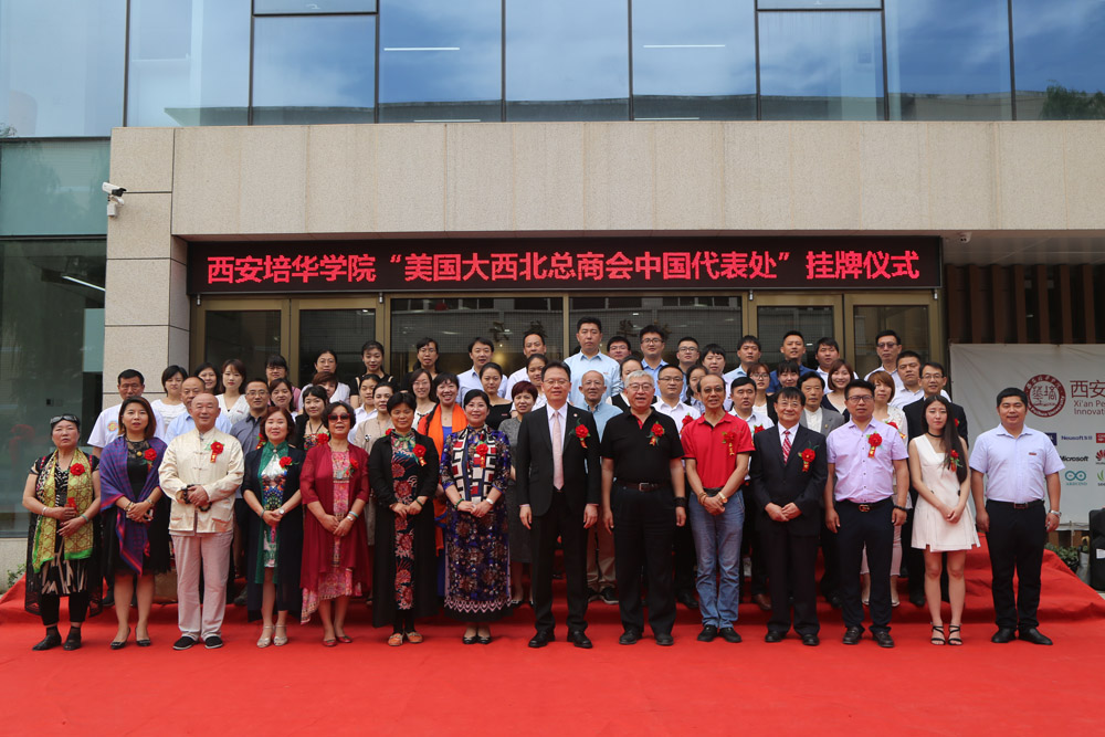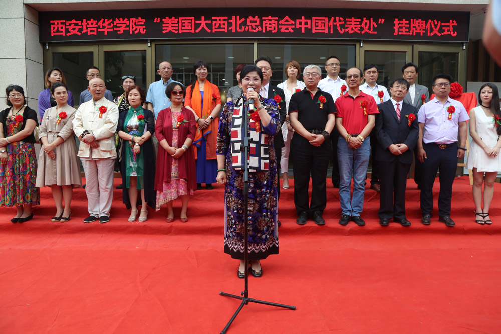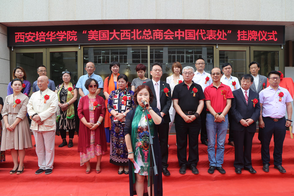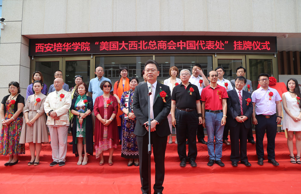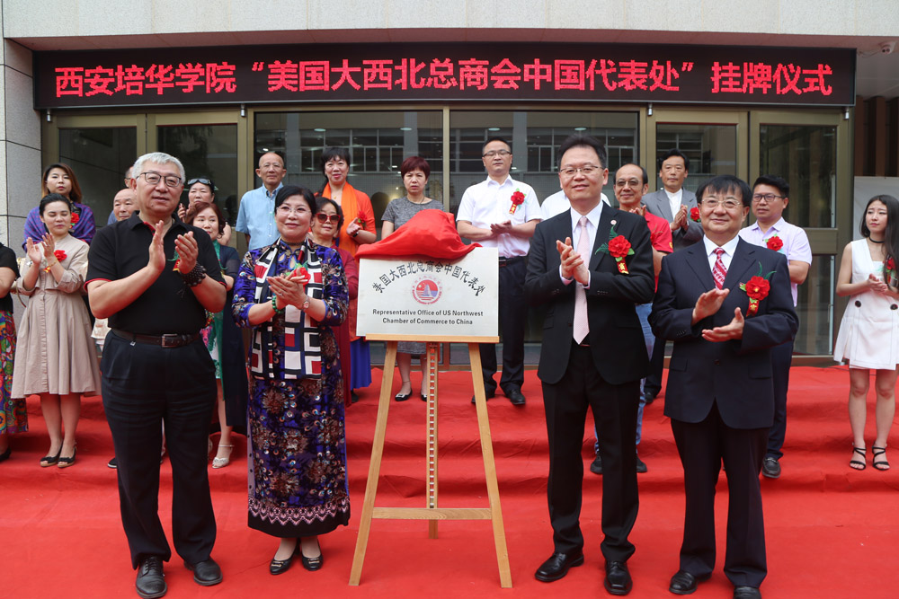 最后,西安培华学院理事长姜波,校长李映方、美国大西北总商会会长江风年、中国国际教育电视台台长李世强一起为“美国大西北总商会中国代表处”揭牌。