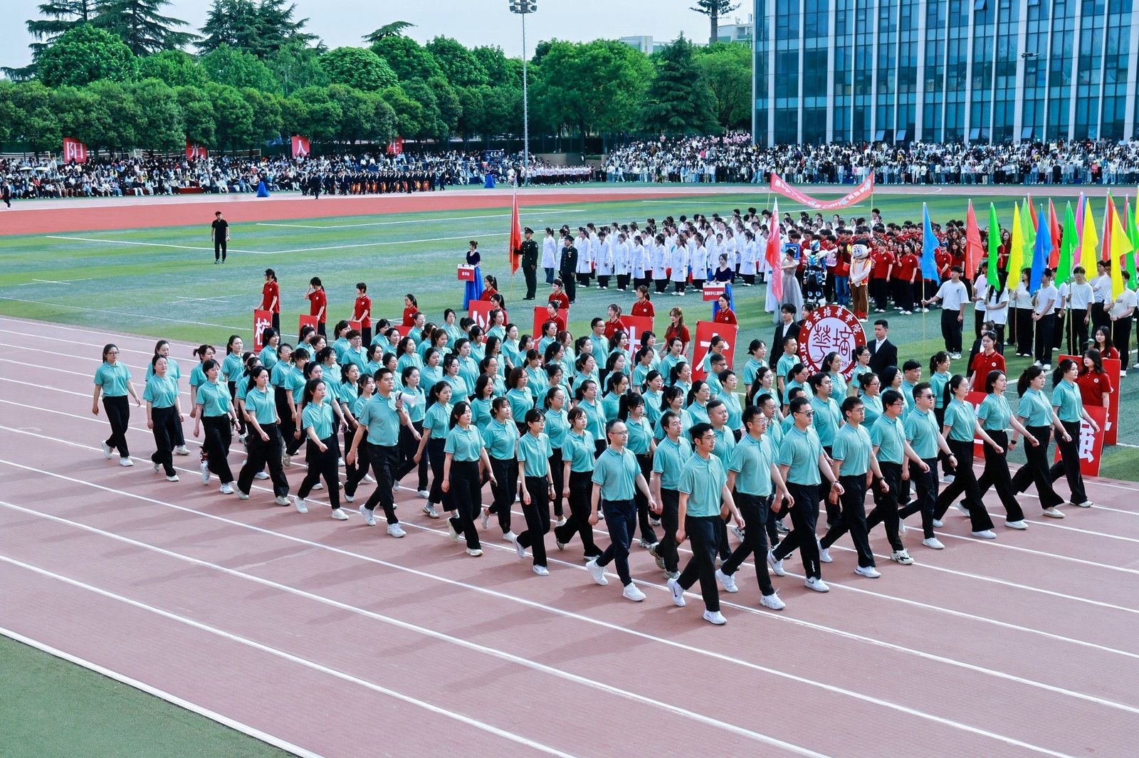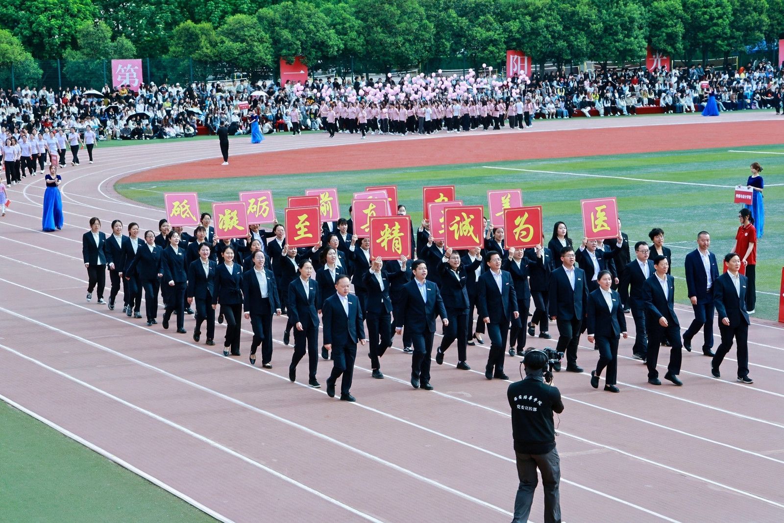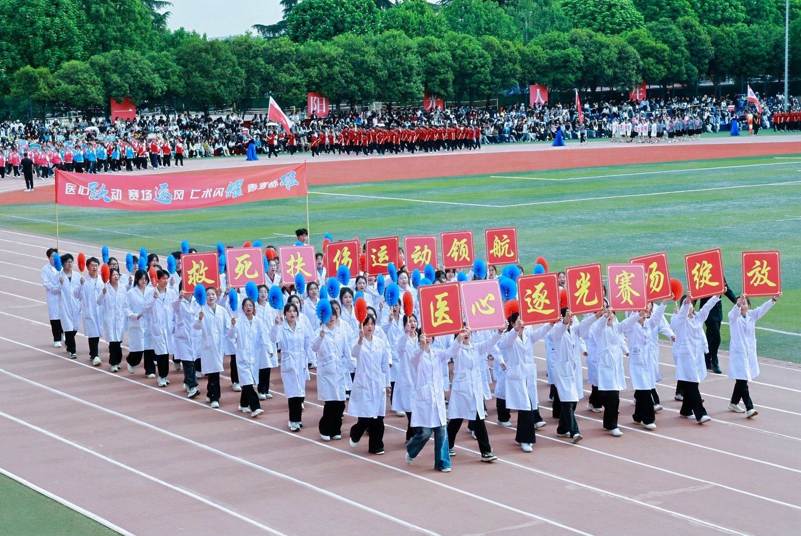 各学院方阵交织出青春长卷,人文与国际教育学院百名奖学金获得者,以书卷化作逐梦羽翼,智能科学与工程学院学子用机械臂叩响未来强音,法学院学子步履铿锵丈量正义维度,医学院学子白袍翻涌如杏林春潮,他们绘就培华最燃青春图鉴!