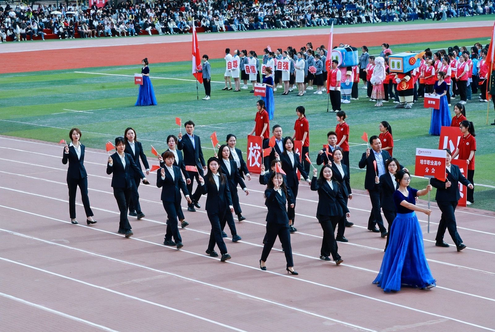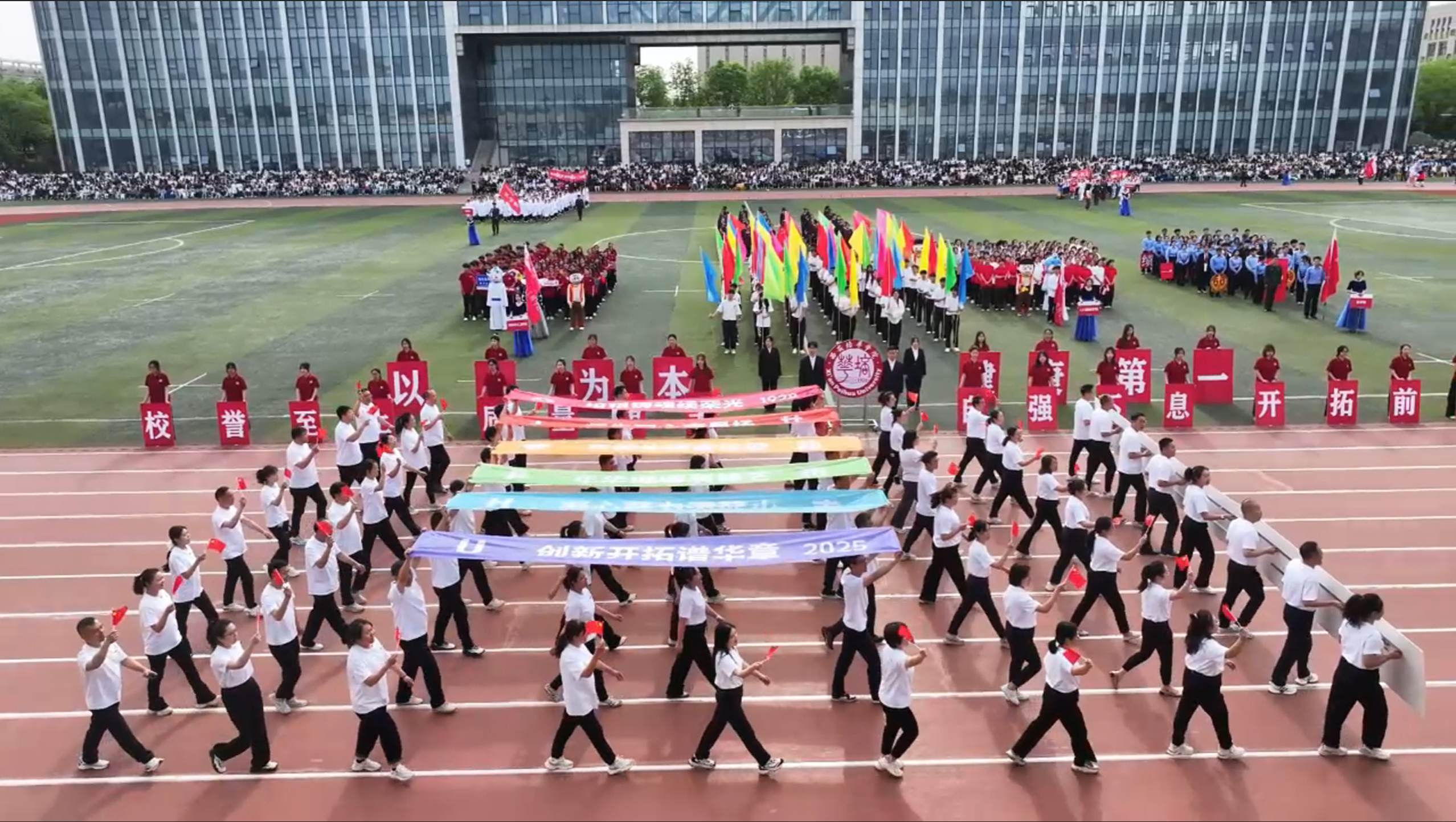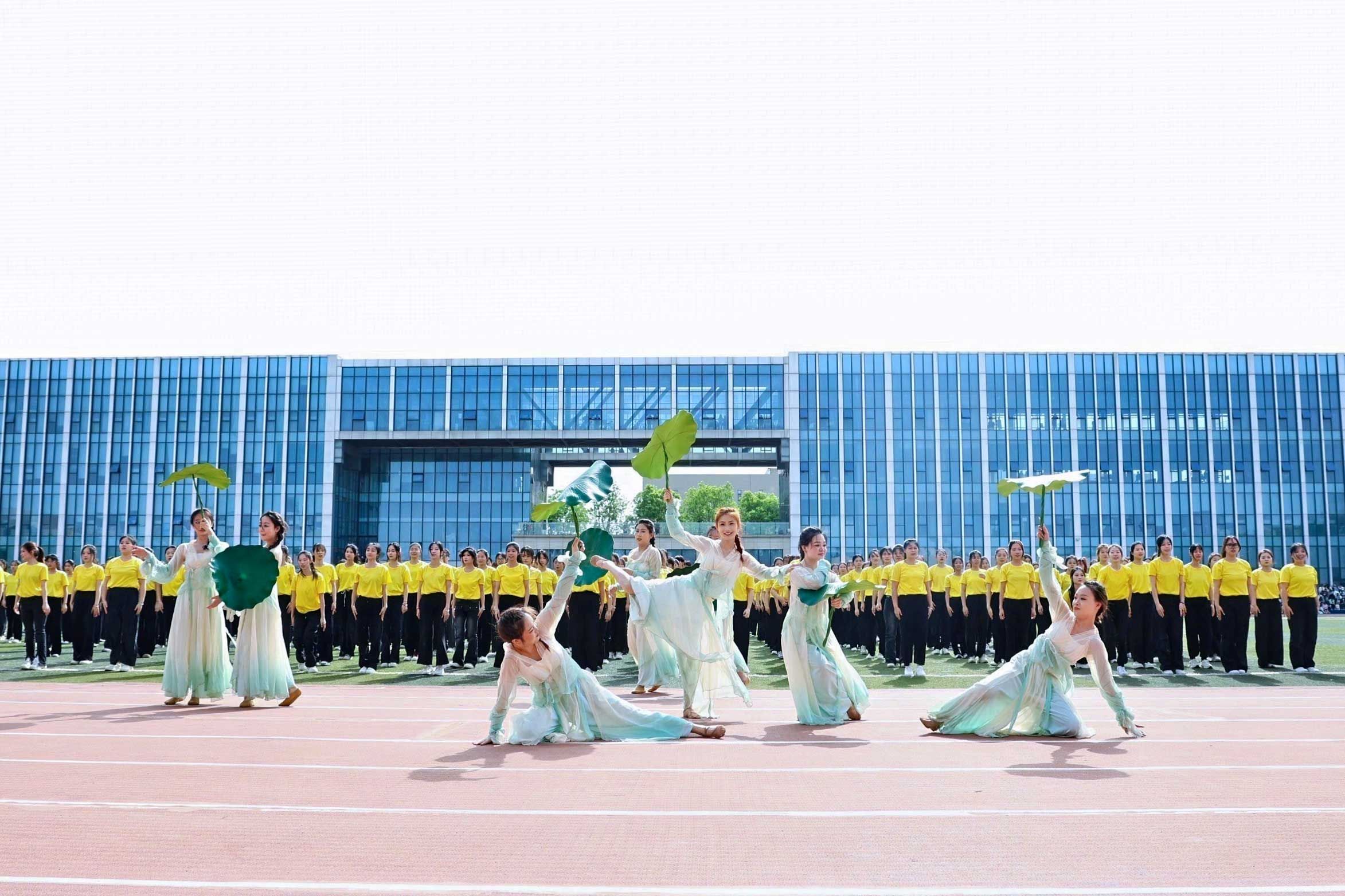 会计与金融学院学子,用民族与神话共舞多元风采,传媒与设计学院学子,执光影为翼转动时代的脉搏,体育学院学子脚步铿锵,目光如炬,浇筑“强国有我”的铮铮誓言!女子学院学子以优雅书写,“巾帼不让须眉”的当代注脚。