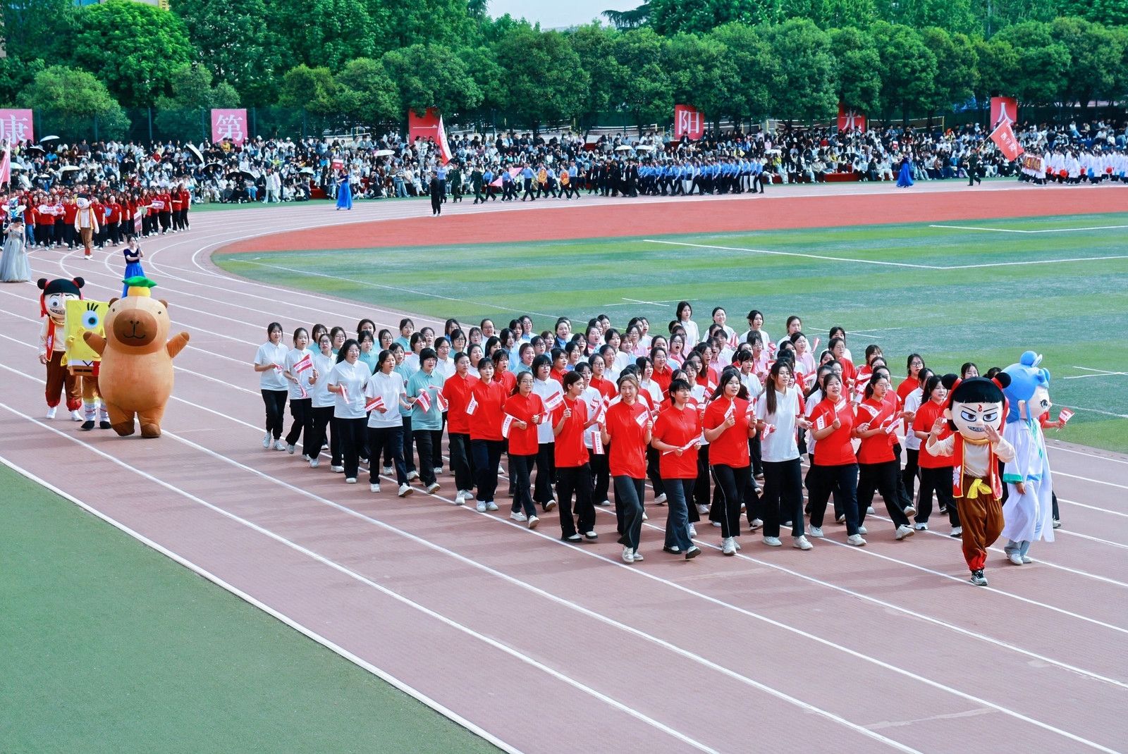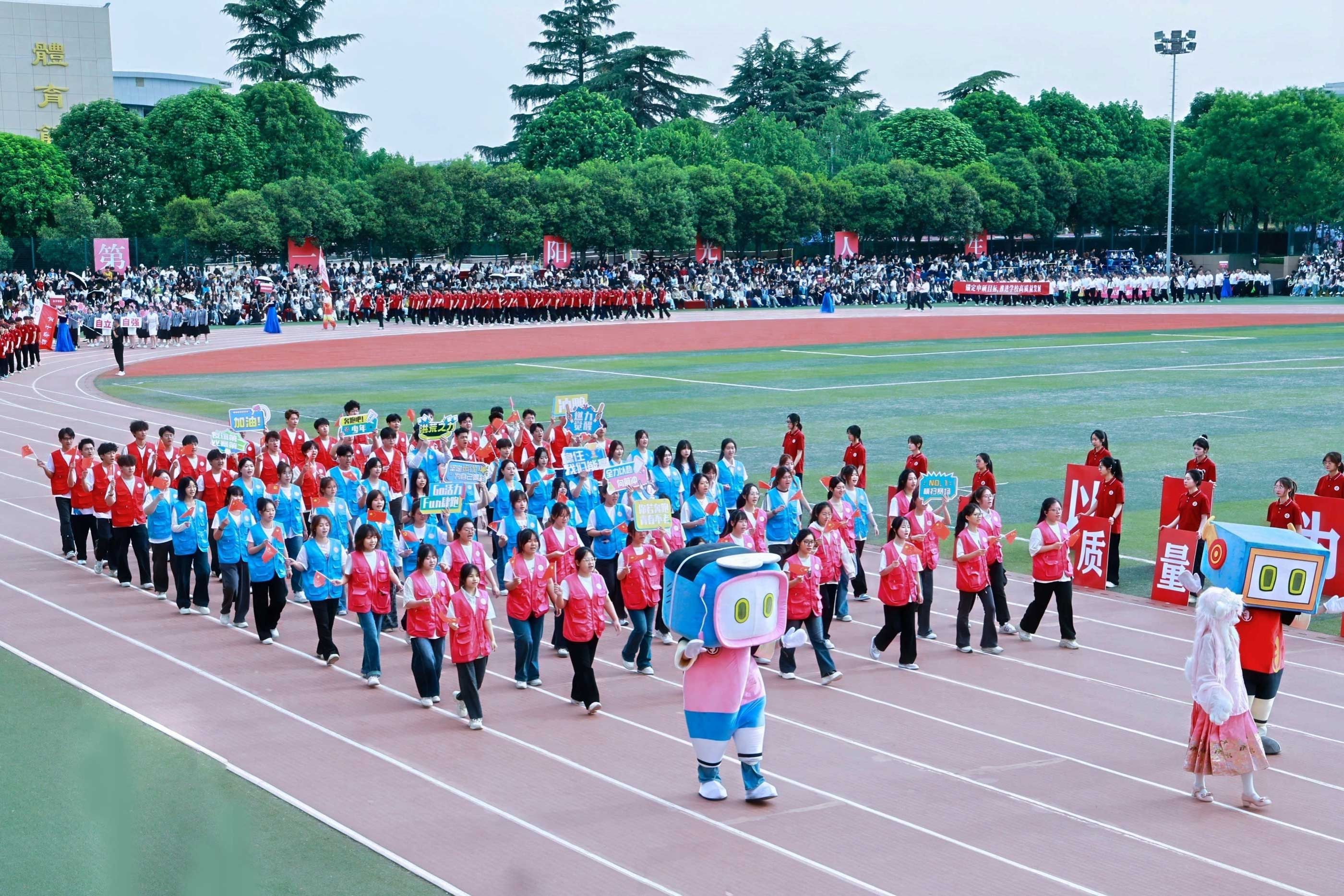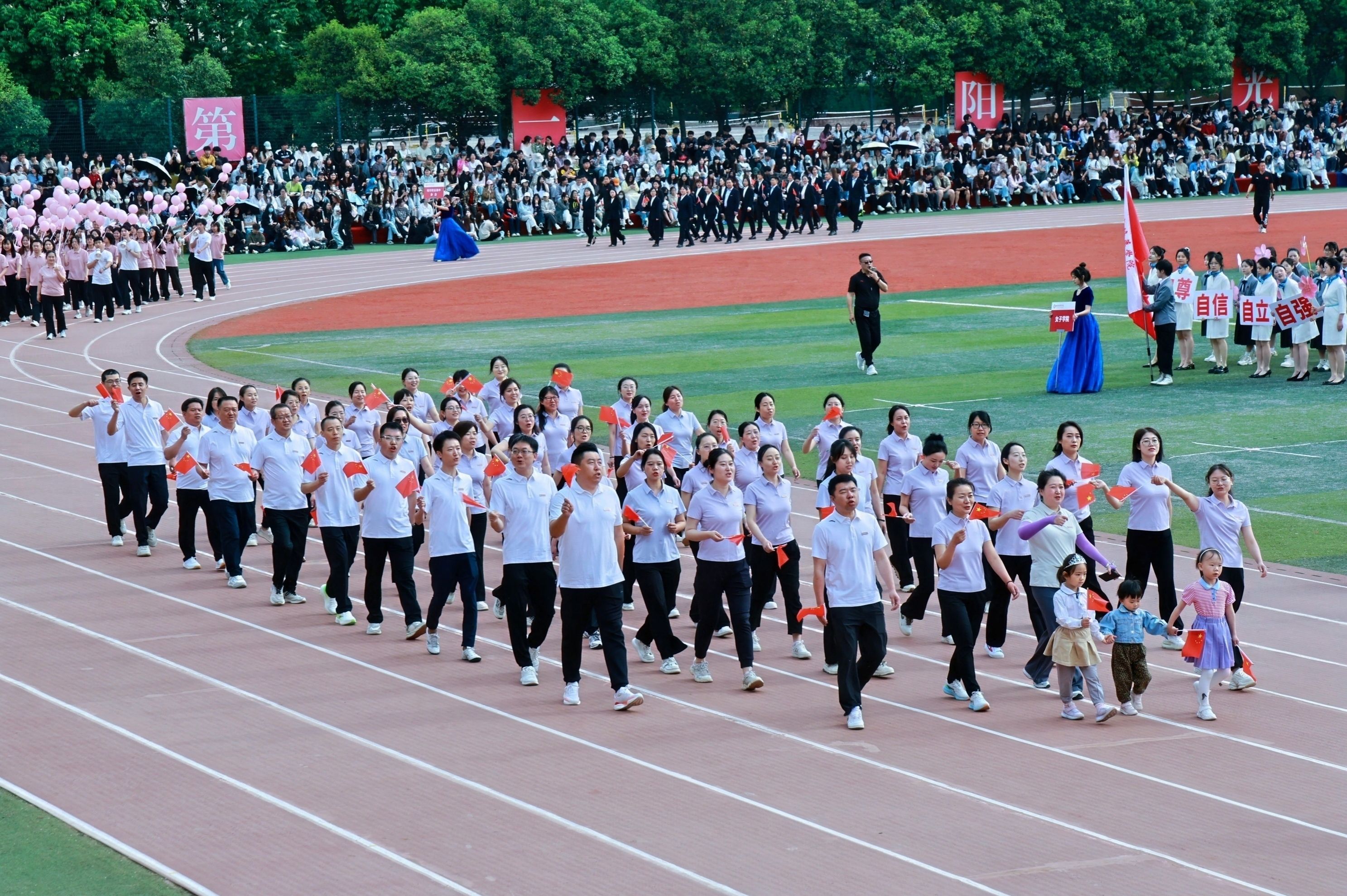 教职工方队化身粉色浪潮,144双手共绘樱花海,老师们秒变追风舞者,团队协作默契满分,欢笑与汗水交织成最萌年龄差表演。