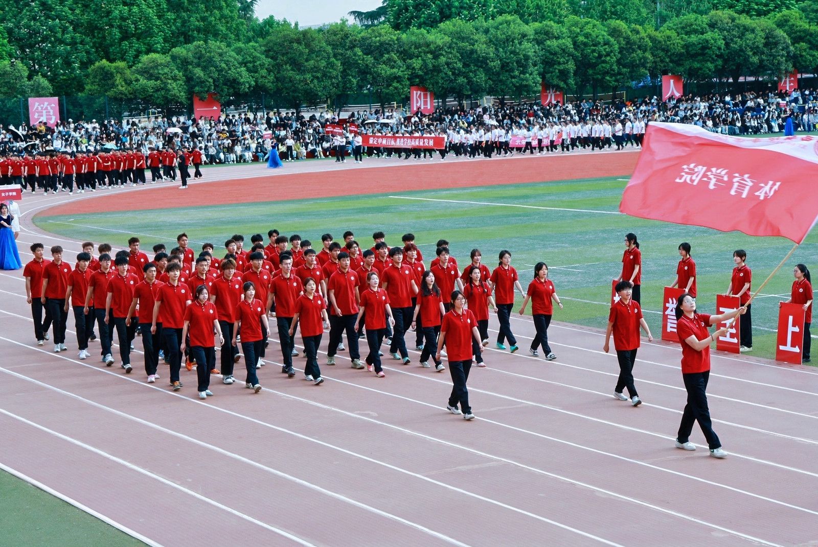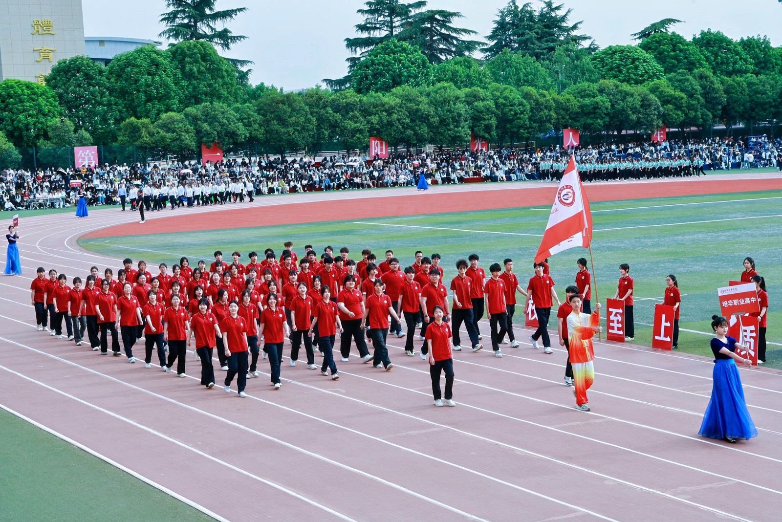 机关教工方阵高举培华,“职业教育、女性教育、红色教育”三大特色基因锚定申硕目标,推进学校高质量发展他们展育人者之担当,显奋进者之光芒,从培根铸魂的初心,到师生同心的凝聚,从百载峥嵘的积淀,到年华璀璨的绽放,他们以智慧为舟,以奉献为桨,在教育的星河中领航。