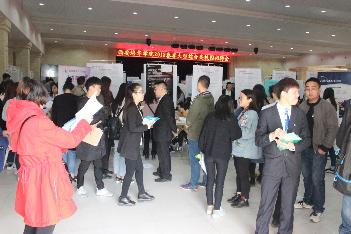 招生与就业指导中心鲍伟主任、王琳副主任来到招聘会现场,并与用人单位进行了详细的沟通,同时,由于本次招聘会参会企业多、岗位质量好,还吸引了西北政法大学、西安财经学院、西安工程大学、西安外国语大学等省内兄弟院校的学生前来参加。继本次招聘会之后,学校还将在本学期举办各种多场不同类型的招聘会,并同步开展系列就业创业指导活动,助力2018届毕业生顺利就业。