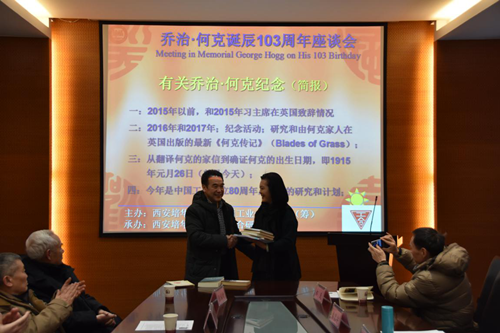 座谈会上,陕西工合(筹)研究员、西安培华学院西北“工合”研究所所长秦泉安向与会者介绍了近年来学术界对乔治·何克及工合运动的研究现状。并向“八办”纪念馆捐赠了乔治·何克中译本著作《我看到一个新的中国》和何克母校英国圣乔治中学提供的部分何克家信(影印件)等珍贵资料。
