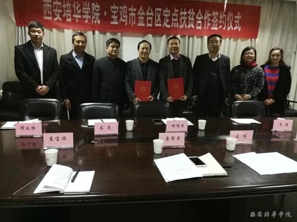 近日,我校党委书记胡俊生一行赴宝鸡市金台区举行“双百工程”扶贫工作推进会,金台区副区长袁军平,扶贫办主任夏宝顺,教体局局长王博、副局长陈雅琴和区人社局、团委等部门负责同志接待了扶贫团一行,双方举行了扶贫协作签约仪式。我校校长办公室主任李健、副主任谭义恒、团委书记蔡亮参加了会议。