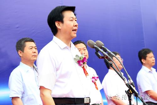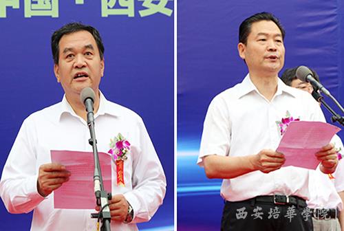 陕西省委教育工委书记李仲为(左)讲话;陕西省教育厅长李兴旺(右)主持开幕