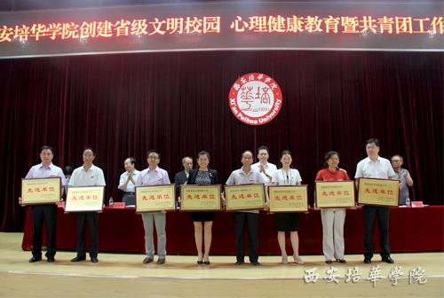 会议首先由王拴才校长宣读《中共西安培华学院委员会、西安培华学院关于表彰创建省级文明校园工作先进单位和和先进个人的表彰决定》,段茂贤副校长宣读《西安培华学院关于表彰2013年度优秀心理辅导站、心理工作者、心理委员的决定》,张栓升副校长宣读《共青团西安培华学院委员会关于表2013-2014学年优秀团员、优秀团干部、优秀团员标兵、先进团支部、学雷锋先进集体、学雷锋先进个人、五四红旗团总支的决定》和《关于表彰西安培华学院第八届大学生课外科技节先进集体和先进个人的决定》。校领导分别为各类受表彰的先进单位及师生代表颁奖。