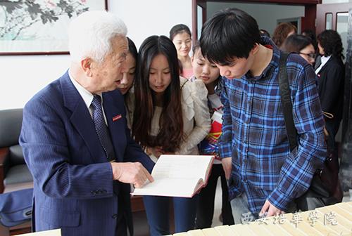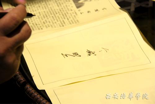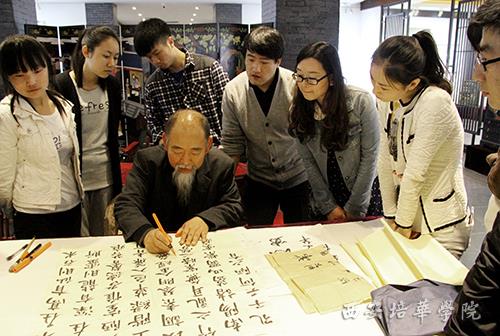 ③日本著名书法艺术家、篆刻家、我校客座教授今城昭二为师生们作关于书法方面的学术报告,现场为学生演示书法写作的技巧,学生们对今城昭二教授的书法技艺表示赞叹。