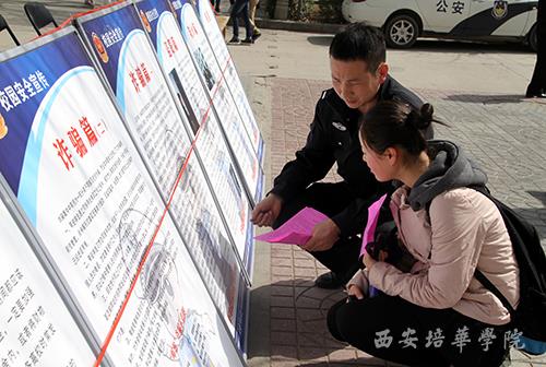 3月17日,由西安市长安区公安分局常宁路派出所和我校联合举办“防火 防盗 防诈骗”为主题的宣传教育活动在文化广场展开,此次宣传活动采用了发放安全防范知识宣传单、安全常识展板宣传、悬挂宣传横幅等方式,向同学们传授基本的防火、防盗、防诈骗知识。这次宣传内容主要结合高校易发生的几种诈骗形式和现实案例,以增强大学生自我安全防范和保护意识,提高我校师生对违法犯罪行为的鉴别能力。