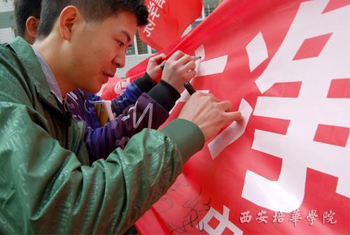 植树节当天我校学生纷纷在横幅上签下环保宣言