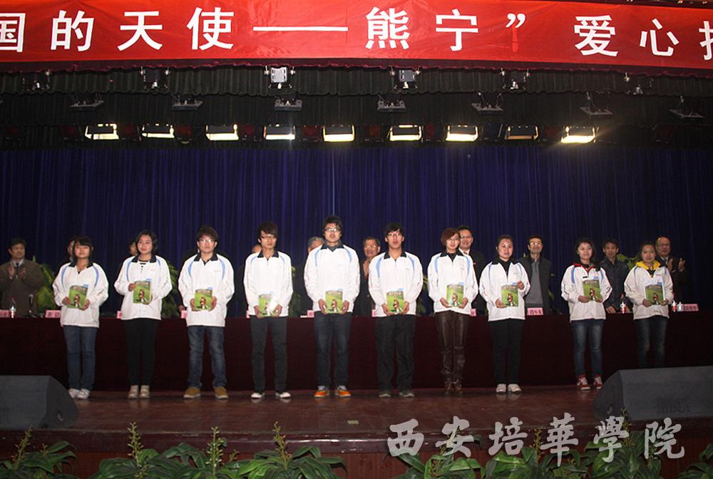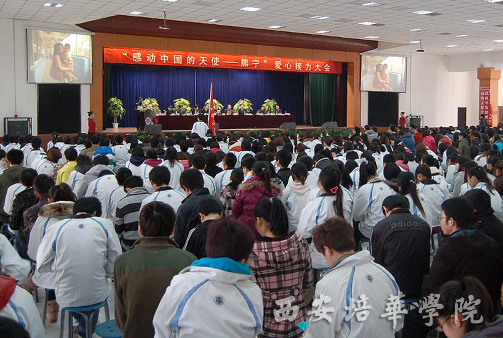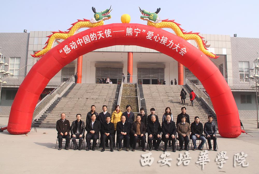 3月10日上午,由陕西熊宁爱心接力促进会(筹)主办,我校承办的“感动中国的天使——熊宁”爱心接力大会在长安校区隆重举行。陕西省决策咨询委员会副主任、省政协原副主席田源出席并讲话,陕西宋庆龄基金会副主席、西安市政协原副主席王俊仁,陕西省军区原副司令韩贵良少将,共青团陕西省委副书记段小龙、中国青年企业家协会副秘书长、隆基集团总裁李瑞斌,陕西省创意文化产业协会会长、话剧《美丽的天使》编剧韩智平,中国青年志愿者协会理事、熊宁的丈夫黄晨,我校陈明华院长等领导在主席台就坐,大会由我校党委副书记、副院长王斗虎主持。