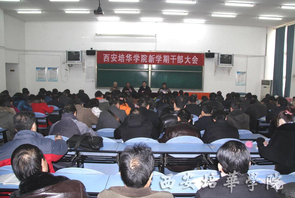 2月26日上午,我校在长安校区隆重召开干部大会,安排部署新学期重点工作。校领导理事长姜波、院长陈明华、党委书记王斗虎、副院长陈胜秋、杨定君、段茂贤、刘应南、王根性、院长助理姜朗出席会议,各院(部)、处(室)科级以上干部参加了会议。会议由杨定君副院长主持,王斗虎书记传达了《陕西省人民政府关于进一步支持和发展民办高等教育的意见》(简称“意见”),陈明华院长部署了2012年重点工作,姜波理事长作了重要讲话。
