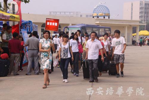 为方便外地的新生来校报道,我校在西安火车站设立了接待点,并有几十辆大巴车往返学校和火车站之间接送新生及家长。