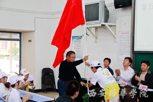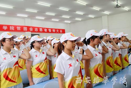 副院长王根性为志愿者授旗。授旗仪式结束后,全体志愿者起立,举起左手庄严宣誓:“我志愿加入2011西安世园会志愿者行列,做一名光荣而优秀的志愿者。我承诺,尽己所能,不计报酬,坚守岗位,服从安排,践行志愿精神,为世园会的胜利召开提供最好的服务!”