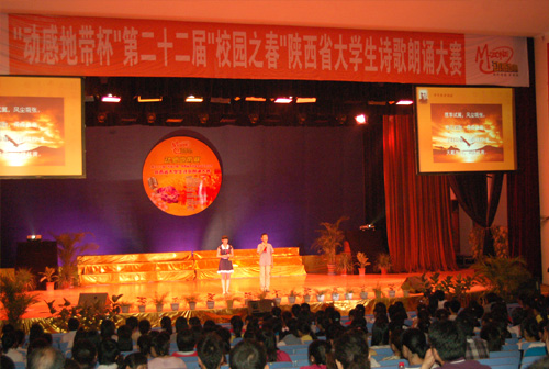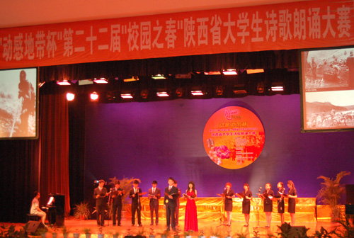 6月9日,西安文理学院大礼堂座无虚席,高潮迭起。由陕西省委宣传部、共青团陕西省委、省教育工委、陕西省学生联合会主办,西安文理学院承办的“动感地带杯”第二十二届校园之春陕西省大学生诗歌朗诵大赛在这里隆重举行。来自全省29所高校的大学生以“朗诵青春,献礼建党九十周年”为主题,同台竞技,各展风采。我校大学生朗诵艺术团在校团委组织部部长高鸣博老师的带领下参赛,在18支获奖队伍中,我校选送的朗诵作品《少年中国说》喜获三等奖。