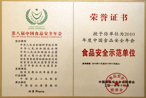 日前,由中华人民共和国科技部、农业部、海关总署、国家工商总局、国家质检总局、国家食品药品监管局和北京市食品安全委员会共同主办,国家发改委和中国食品工业协会共同支持,中国食品质量报社独家承办,全国高科技食品产业化委员会和中国民族贸易促进会联合协办的第八届中国食品安全年会在北京隆重举行,本届年会以“确保食品安全,构建和谐社会”为主题。我校在本届年会上被专家委员会评为“全国食品安全示范单位”称号。
