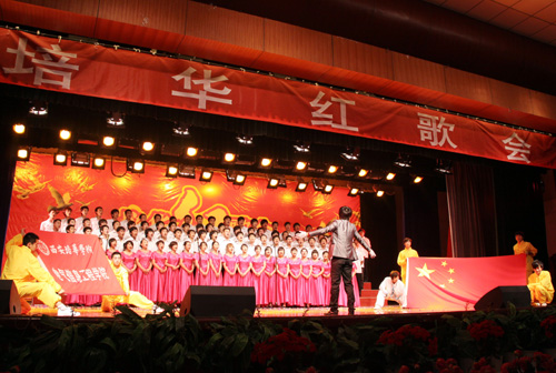 6月2日晚,长安校区大学生活动中心处处洋溢着喜庆的气氛,第二届培华红歌会在此隆重举行。理事长姜波博士、院长陈明华教授、副院长杨定君、段茂贤、王根性、刘应南等校领导及各院(部)、处室的有关领导和师生千余人观看了红歌会。姜波理事长在会上作了重要讲话。