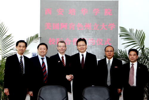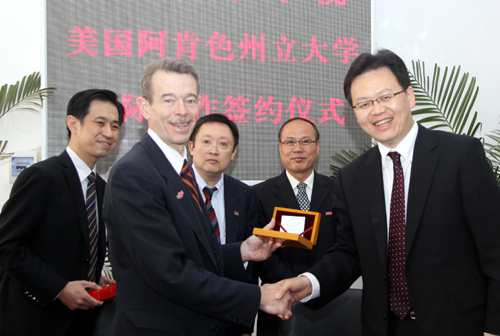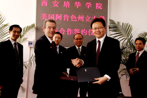 美国阿肯色州立大学常务副校长(Daniel G. Howard)博士、阿肯色州立大学中国部主任沈明华(Stephen Sim)博士等一行应邀于近日专程来我校参观访问,并于5月19日上午在我校长安校区会议室与理事长姜波博士、院长陈明华教授等领导进行了亲切友好的会谈。双方就如何建立友好校际关系、学术交流合作、开展“4+0”、“3+1”模式合作办学事宜充分交换了意见并达成了共识。座谈会结束后,双方签署了《合作交流框架协议书》和《谅解备忘录》。