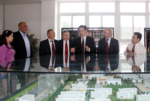 在长安校区,姜波理事长、国际交流中心主任秦泉安热情接待了艾克玛先生先生一行。在姜理事长的带领下,艾克玛先生一行首先参观了我校的模拟沙盘,姜理事长现场介绍了我校的基础建设、专业建设、学科设置等情况。参观结束后,双方在会议室进行了亲切会谈。姜理事长代表我校对艾克玛先生一行的到来表示热烈欢迎,并简要介绍了中吉两国的友好关系和我国民办高等教育的现状。姜理事长介绍说,培华学院是中国成立较早的民办大学之一,已具有82年的办学历史。培华从1984年起就开始同国际高校建立交流合作关系,迄今为止已和30多个国家和地区的高校、社会团体建立了友好合作关系,很高兴通过省侨联和吉方的商业贸易大学、基金会进行交流,希望吉方的商业贸易大学和国家文化发展基金能和我校开展广泛而积极有效的交流与合作。