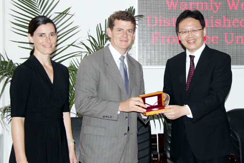 我校理事长姜波博士、院长陈明华教授等在长安校区会议室接待了访问团一行。院长陈明华教授向客人简要介绍了我校的办学历程、发展现状、未来规划,教育教学等情况,指出我校一直致力于扩大对外交流合作、积极寻求合作机会并愿意为下一步走向国际化做好全方位的准备等,双方还就建立友好姊妹院校、开展学生交流、教师交流;互访和合作开展学术合作、课程引进等达成一致,双方将在近期就教育部深入探讨尽快建立友好合作和开展实际交流的安排达成框架协议。