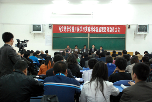下午2点30分,我校深入学习实践科学发展观活动领导小组组长、党委书记王斗虎作了题为《以学习实践科学发展观活动为动力 推进我校各项工作又好又快的发展》的动员报告,对我校深入学习实践科学发展观活动的重大意义、指导思想、目标要求和方法步骤进行了深刻阐述。王书记的讲话分为四个部分:(一)深刻认识开展学习实践科学发展观活动的重大意义;(二)准确把握开展学习实践科学发展观活动的指导思想,目标要求和主要原则;(三)认真做好学习实践科学发展观各阶段的工作;(四)加强组织领导,确保学习实践科学发展观活动取得实效。王书记要求在学习实践活动开展过程中,各级领导要坚持高起点、高标准、严要求,严格按照《西安培华学院开展深入学习实践科学发展活动实施方案》规定的指导思想、目标要求、方法步骤及每个阶段的任务进行。