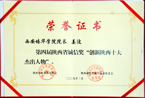 3月27日下午,由陕西省企业信用协会主办的祝贺改革开放30周年暨第四届陕西诚信奖辉煌盛典在陕西宾馆礼堂隆重举行。原陕西省委书记安启元、陕西省人大常委会副主任刘遵义、省国有资产管理委员会原主任邱世杰、陕西省事务管理局原局长靳山旺等领导和企业界知名人士出席盛典。第四届陕西诚信奖:创新陕西十大杰出人物奖、诚信陕西社会责任年度人物奖、诚信陕西企业家年度人物奖、陕西省信誉品牌奖、陕西省改革开放30年荣誉奖、陕西十大社会企业责任功勋企业家、陕西经济十大最具影响力诚信人物等奖项现场揭晓。我校理事长、院长姜波博士参加盛典,并荣获“创新陕西十大杰出人物奖”。