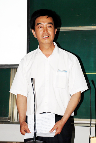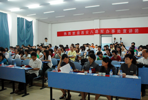 为了深入贯彻落实科学发展观,加强爱国主义教育,弘扬红色文化,培育民族精神。5月8日下午,我校特邀西安八路军办事处纪念馆(以下简称八办纪念馆)宣讲团一行10人来到长安校区为学生作主题为“理想·信念”的报告。院办副主任秦泉安,文法学校副院长车宝仁,团委副书记赵君慧,团委宣传部部长王翠等老师与各院系300名师生代表共同聆听了报告会。文法学校副院长车宝仁教授主持报告会。
