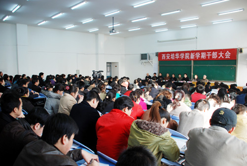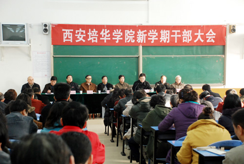 2月21日上午9点,新学期干部工作大会在我校长安校区阶梯教室举行,理事长、院长姜波,党委书记王斗虎,副院长陈明华、陈胜秋、周振豪、杨定君、李天禄,院长助理姜朗,校总会计师陆忠明及全体教职员工参会。大会由校党委书记王斗虎主持,理事长、院长姜波安排部署了学校2009年工作任务,党委书记王斗虎做了动员讲话。