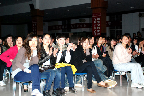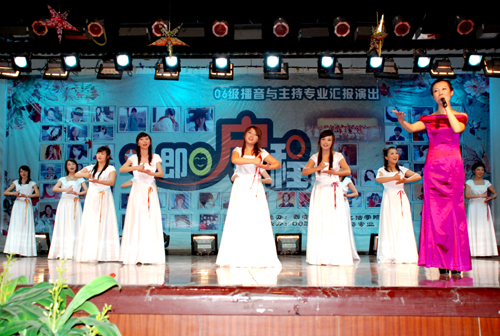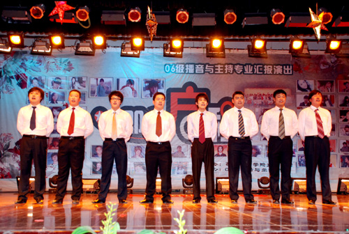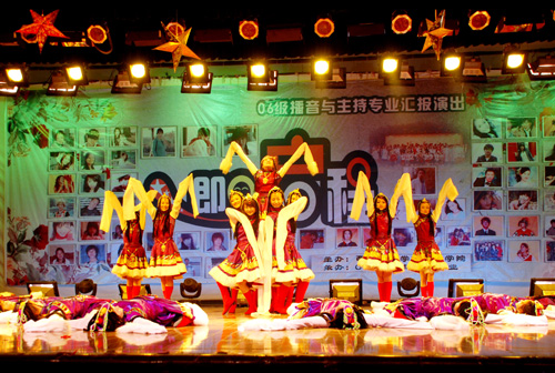 在我校配音表演还是第一次被搬上舞台,电影《叶塞尼亚》、《千与千寻》、《哈姆雷特》中经典片段的配音表演成为整场晚会的一大亮点,当那些熟悉的画面再次回放时,同学们的表演就如原音重现一般,将每个角色都表现得淋漓尽致。节目中由06级播音班全体女生表演的舞蹈《雪域之声》是大多数同学在没有一点舞蹈基础的情况下排练而成的;由8名男生组成的“千金组合”为大家表演的歌舞《朋友再见》更是用一种幽默、滑稽的表演“雷倒”了全场观众,将晚会的气氛推向了最高潮。