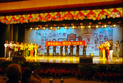 晚会在歌伴舞《放心去飞》的节奏中结束,全体06级播音班学生在写有“请母校放心,我们会飞的更高”的横幅上签名留念。