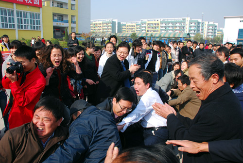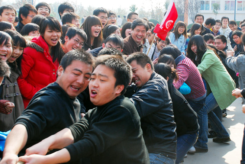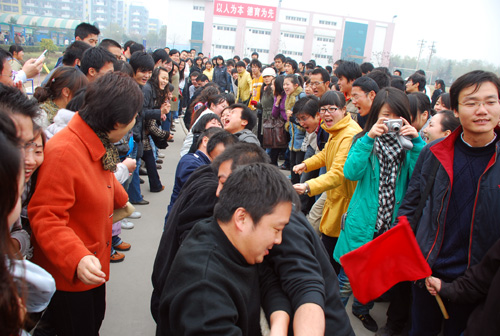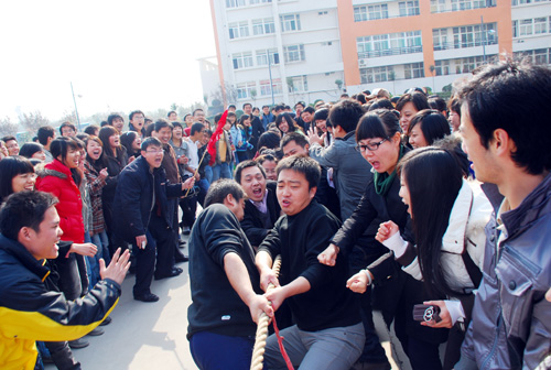 为落实姜波院长提出的“全民健身,健康工作”理念、进一步推动“平安、文明校园”的创建工作、弘扬奥林匹克精神,11月20日中午12点半,由校工会组织的教职工拔河比赛在我校足球场举行。院长姜波、党委书记王斗虎、工会主席陈明华、工会副主席田红、各院(系)处(室)领导到场观看比赛并为队员们加油助威。