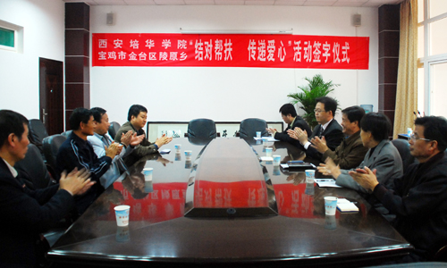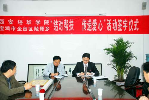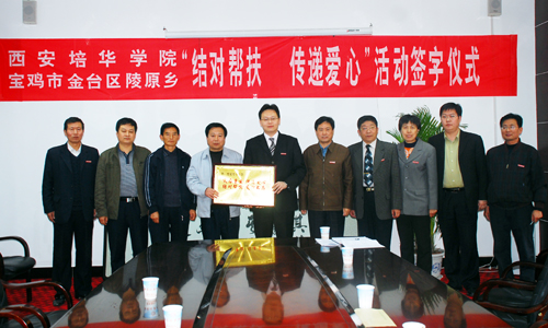 姜波院长作重要讲话,他首先向灾区表示问候,并希望灾区人民齐心协力,共度难关,早日把家乡建设好。培华作为民办高校,在资金并不宽裕的情况下,依然设立专项资金用于灾区的重建和教育事业。这次捐助的10万元用于扶持受灾比较严重的陵原乡紫原村,以尽培华绵薄之力,以后还将力所能及地在教育方面为陵原乡提供教学以及计算机等设施的帮助。姜院长还表示,培华对受灾严重的宝鸡一直很关注,希望尽快将结对帮扶款项落到实处,尽快将村组织的活动场所保质保量地建设好。