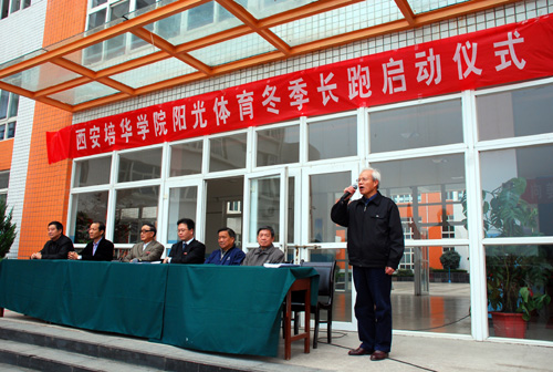 仪式由校运动委员会副主任杨定君副院长主持。校运动委员会主任姜波发表了热情洋溢的讲话。首先,姜院长肯定了开展阳光体育工程的重要意义。他强调阳光体育工程的开展不仅能传播健康的生活理念,而且可以促进全体学生健康水平的提高。同时,他要求我校体育部要将体育教育工作抓紧抓实,做到体育课教学与课外体育活动相结合,通过形式多样的特色体育活动提高学生的身体素质和增强同学们的健身意识。姜院长号召我校全体同学积极参与冬季长跑活动,做到增强体质、快乐学习、健康成长。
