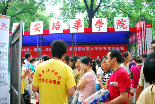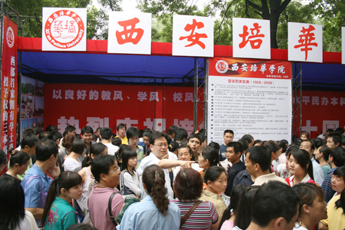 7月1日,来自省内的44家民办高校在短短半天时间内就吸引来万余名学生和家长前来咨询。为全面展示培华的教育教学特色,反映我校大学生丰富多彩的校园生活,为考生和家长提供全面、真实的信息,让考生和家长了解我校的教学状况,熟悉我校招生政策,我校参加了此次咨询会。招生办、各院系、各有关单位都设置了展台,均有专人面对面解答考生、家长关心的问题。