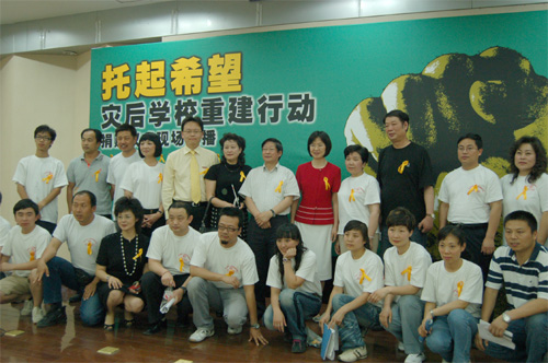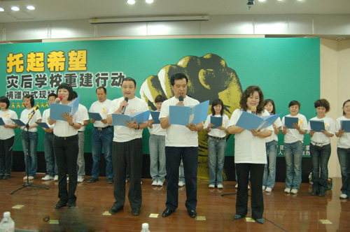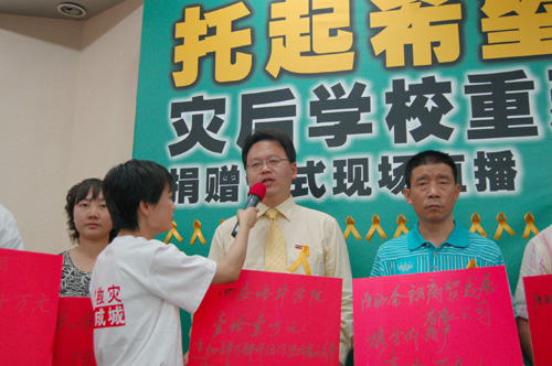 在活动将要结束时,主持人慷慨激昂的说:“节目可以结束,募捐活动可以结束,但爱心的传递不会结束,希望有更多的人加入到“托起希望——灾后学校重建行动”的活动中来。