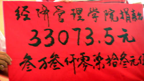 经济管理学院这次自发的捐款,是我校启动“托起希望 灾后学校重建行动”赈灾捐款活动启动后收到的最大一笔单项捐款。这份善款不仅代表者每一个经管人的对灾区人民的关心,更代表着众多培华人心手相连的爱心。我们有理由相信,在全国人民的群策群力之下,灾区人民一定可以重建美好家园。